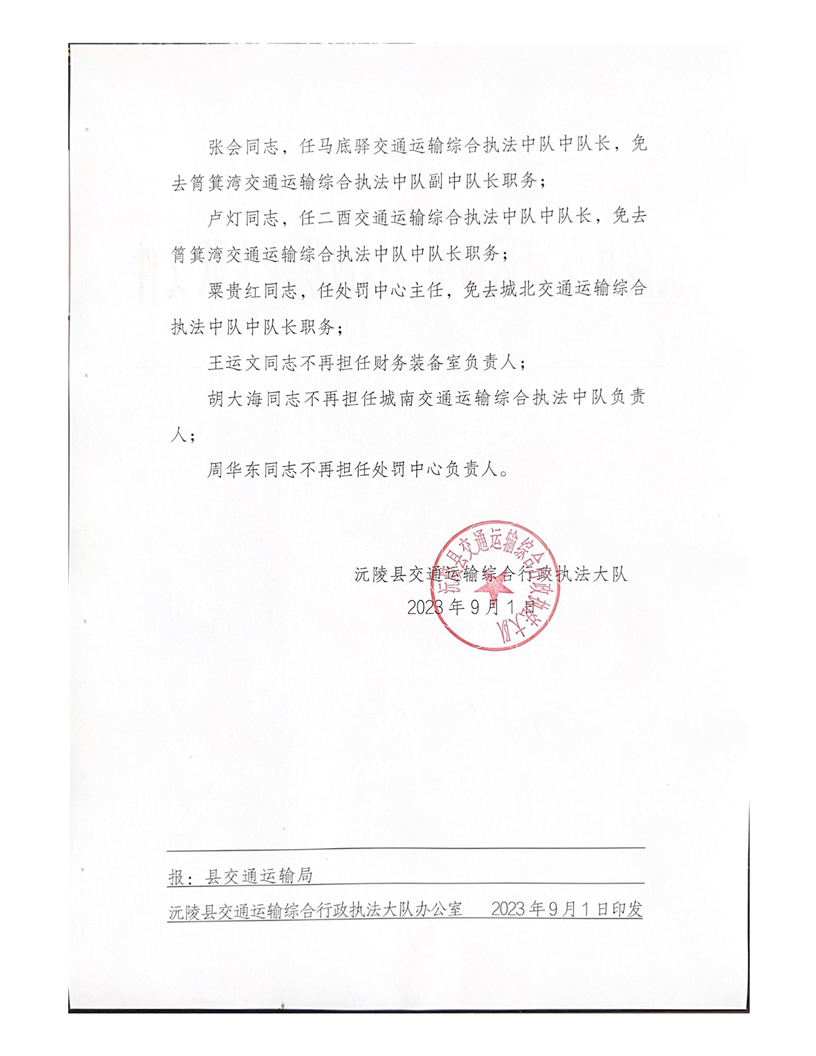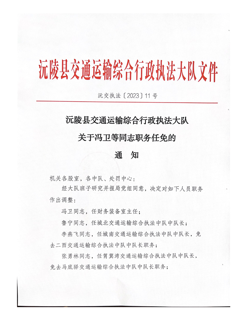 沅陵县交通运输综合行政执法大队关于冯卫等同志职务任免的通知