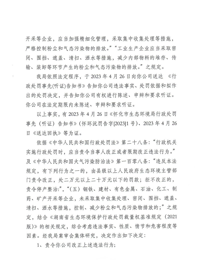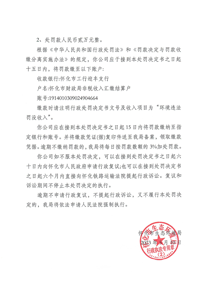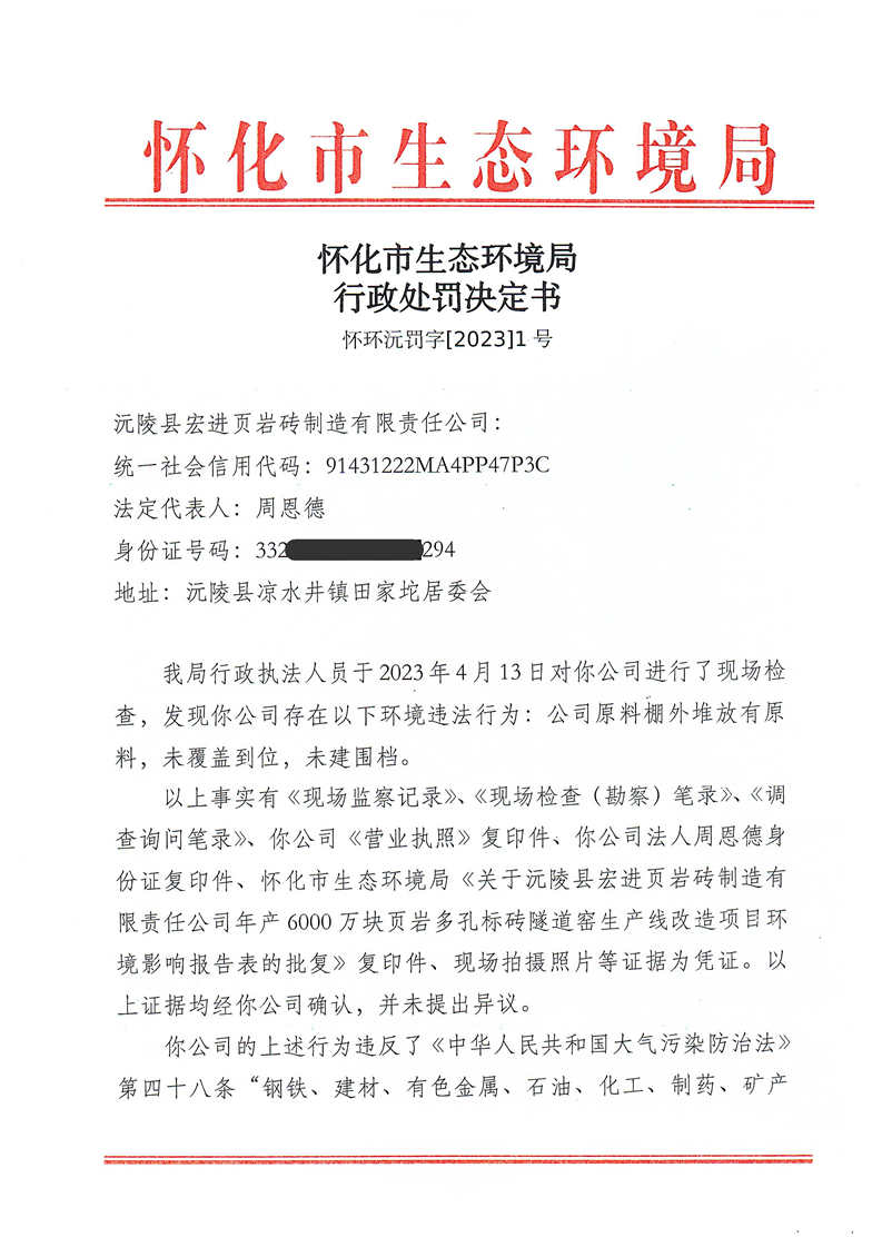 怀化市生态环境局行政处罚决定书怀环沅罚〔2023〕1号