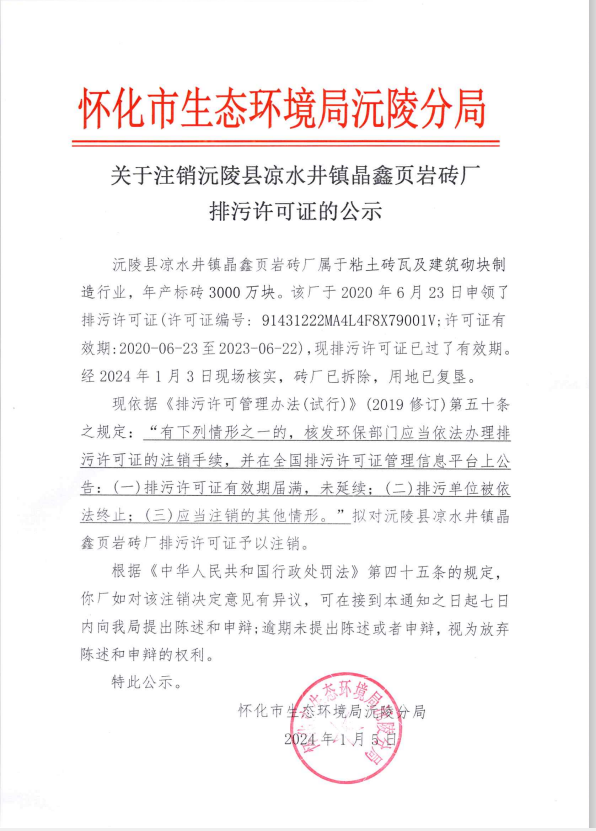 怀化市生态环境局沅陵分局关于注销沅陵县凉水井镇晶鑫页岩砖厂排污许可证的公示