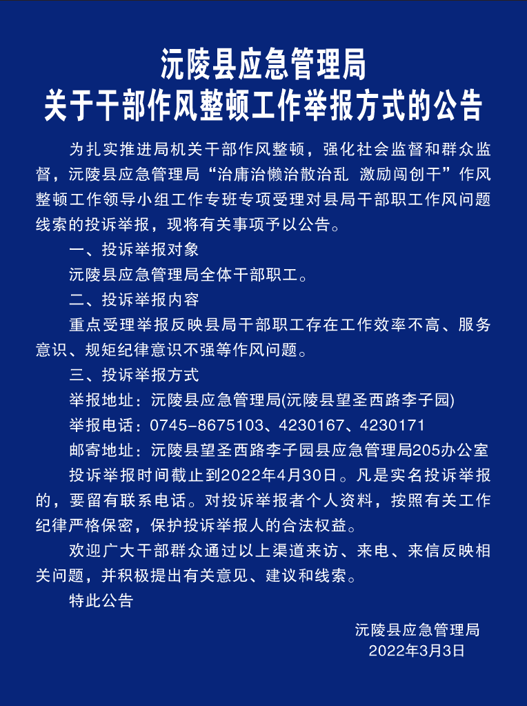 沅陵县应急管理局关于干部作风整顿工作举报方式的公告