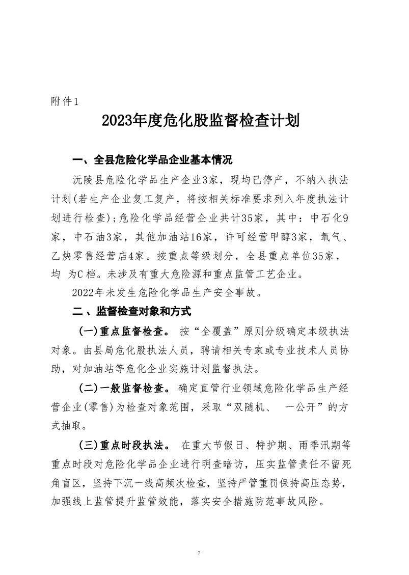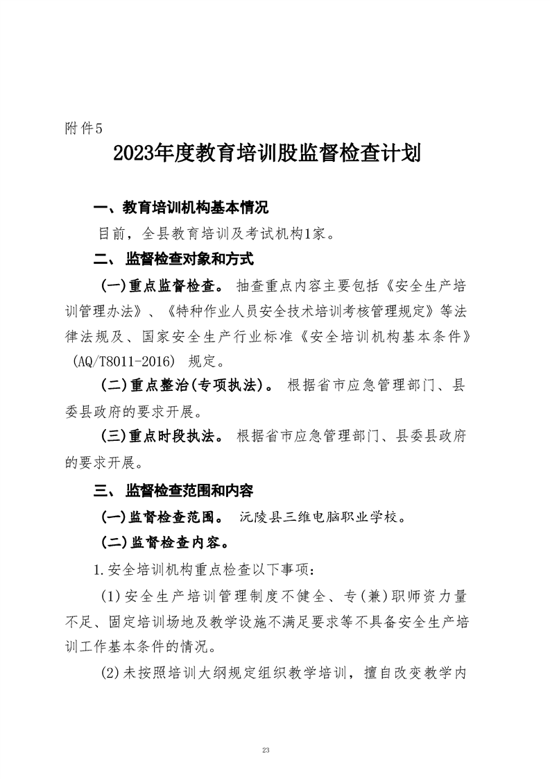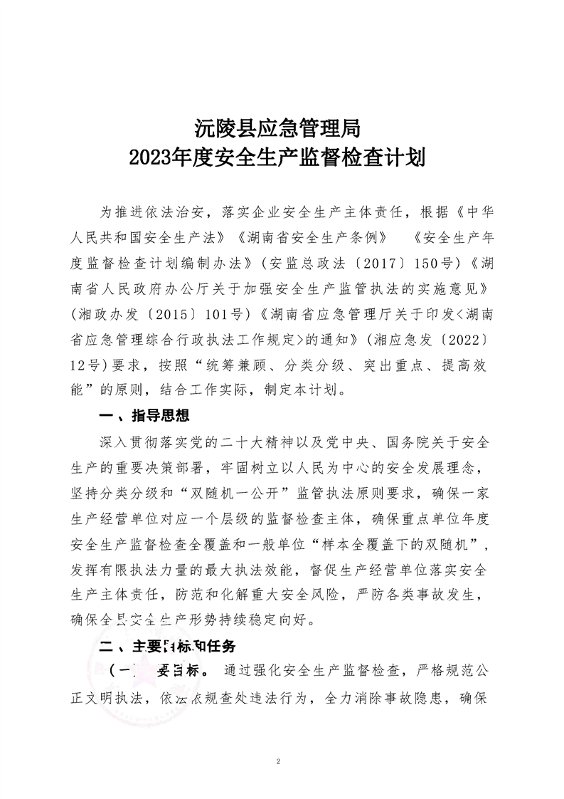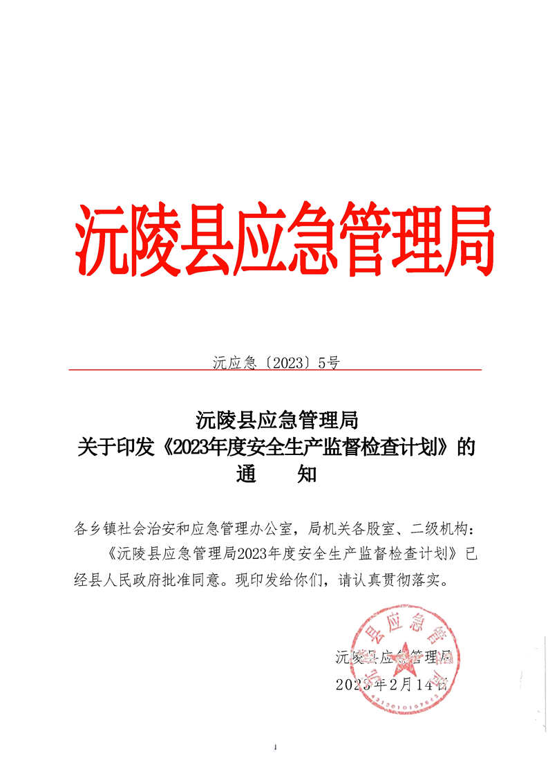 沅陵县应急管理局关于印发《2023年度安全生产监督检查计划》的通知
