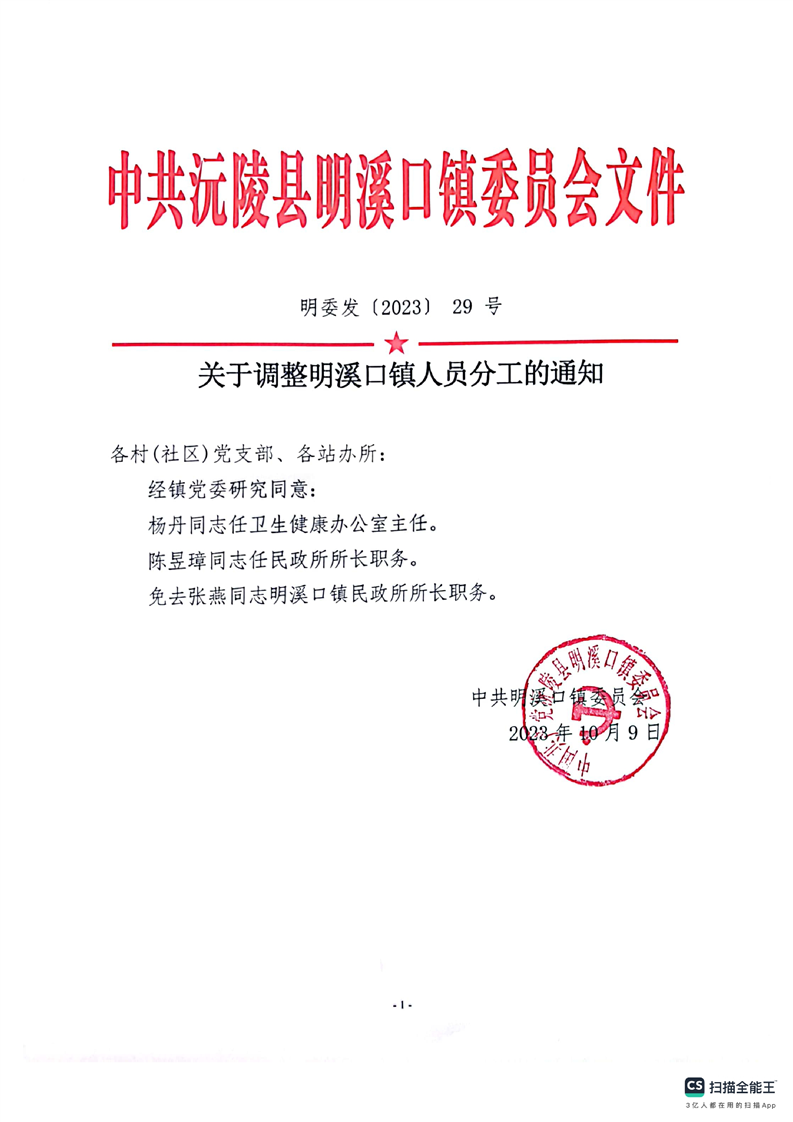 关于调整明溪口镇人员分工的通知