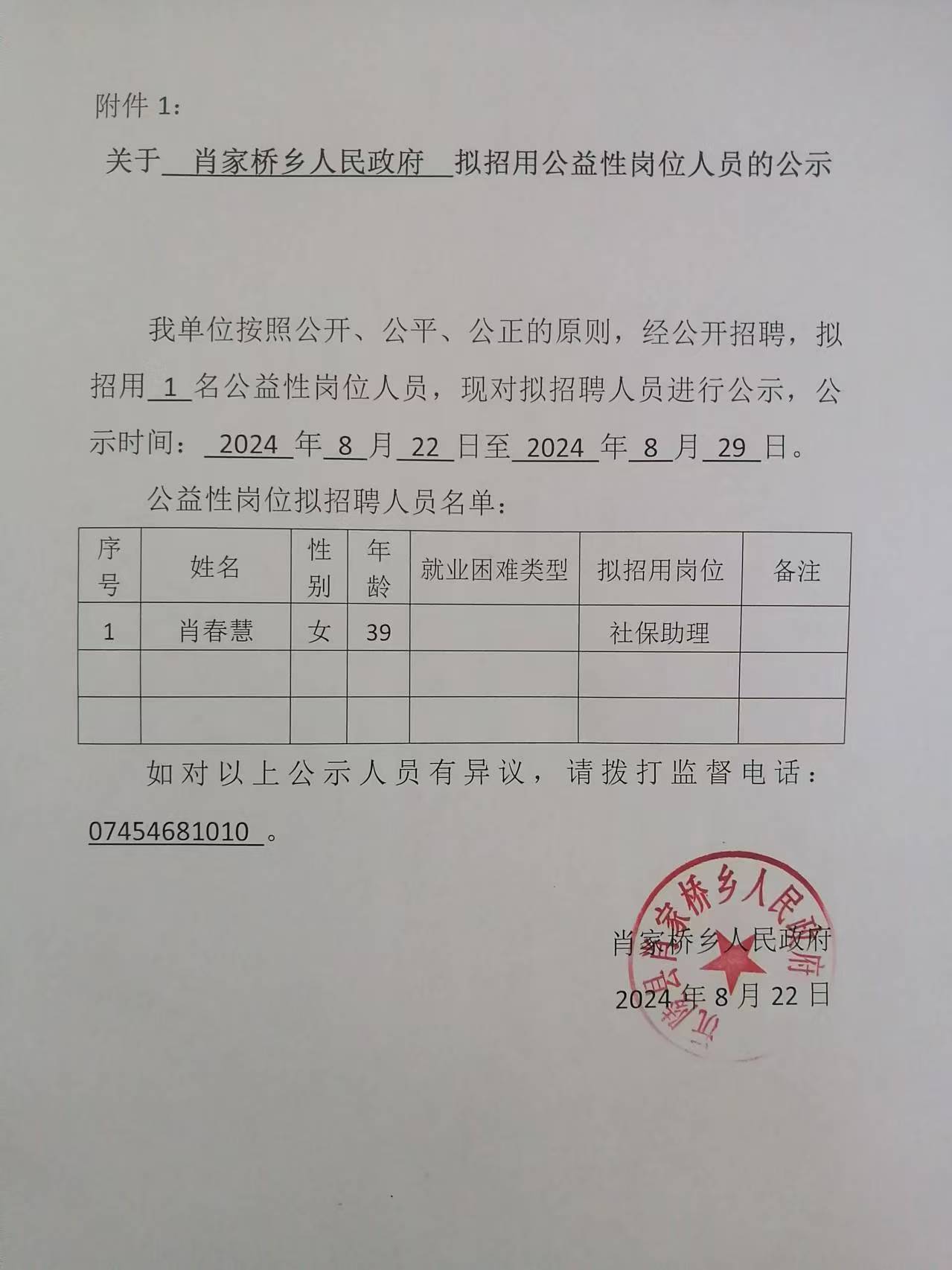 关于肖家桥乡人民政府拟招用公益性岗位人员的公示