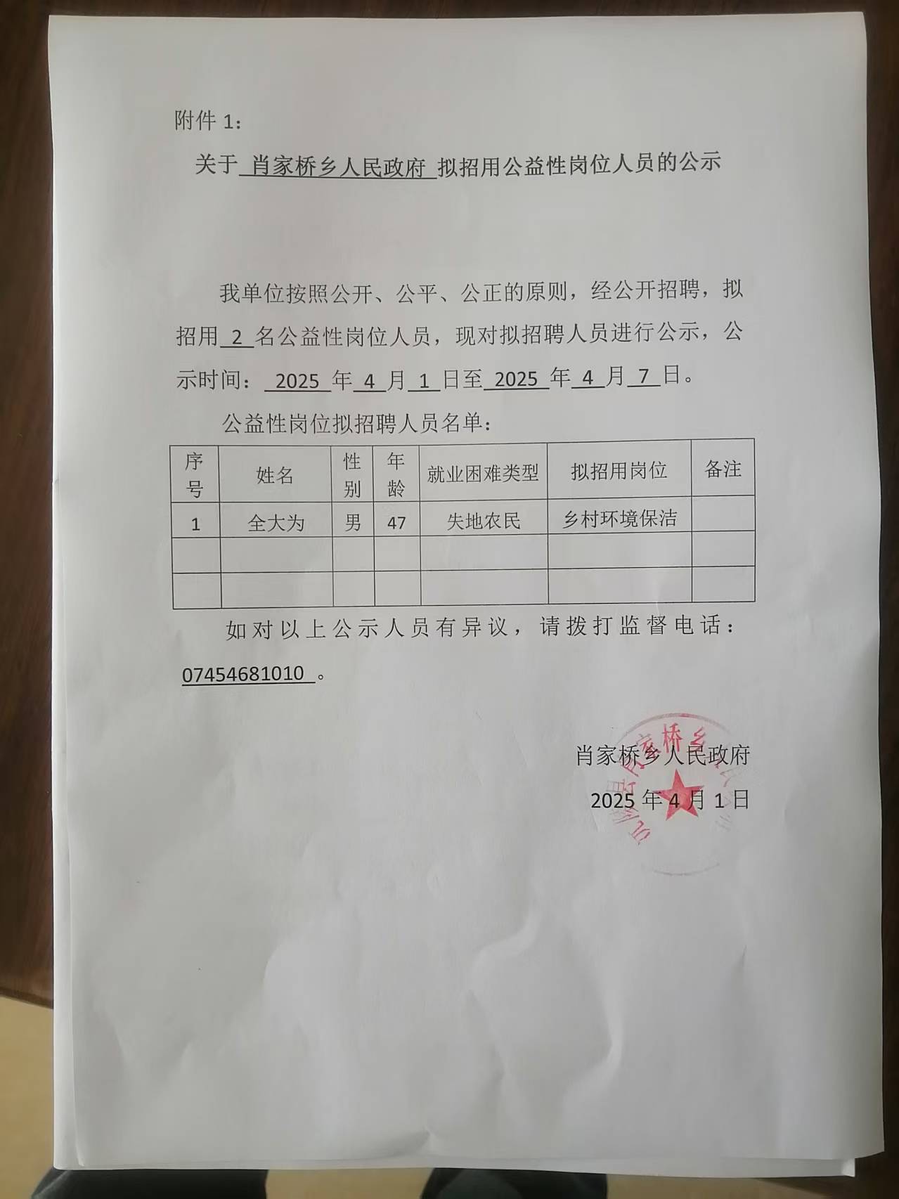 关于肖家桥乡人民政府拟招用公益性岗位人员公示