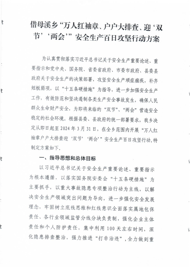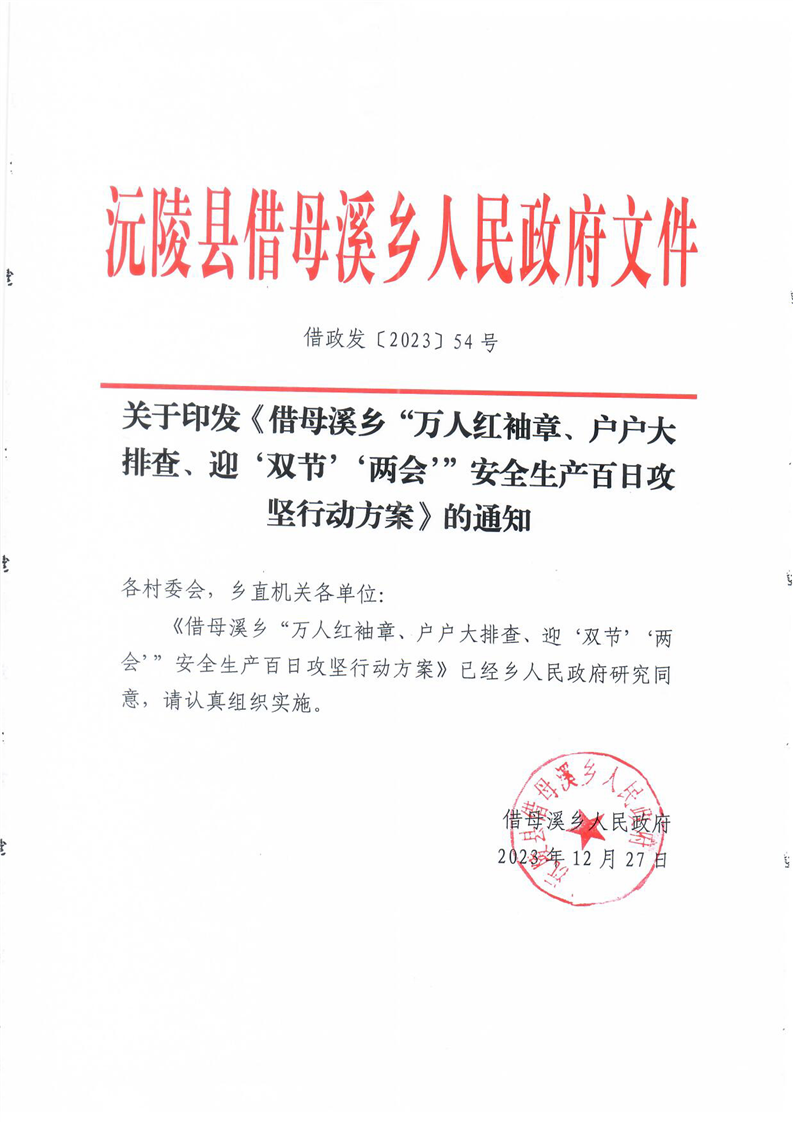关于印发《借母溪乡“万人红袖章、户户大排查”迎双节、两会、安全生产百日攻坚行动方案》的通知