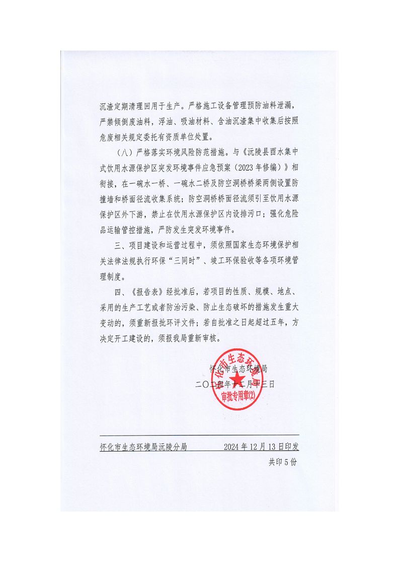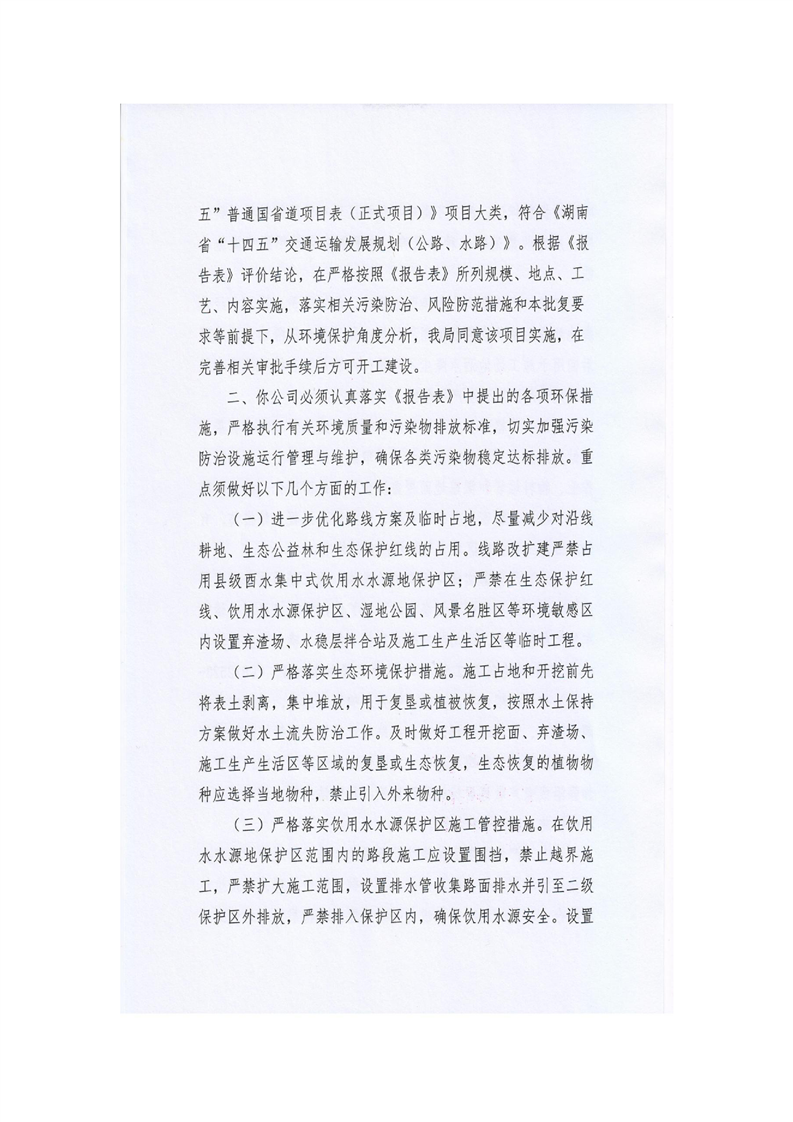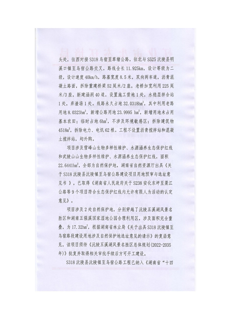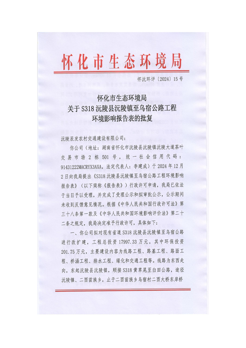 怀化市生态环境局关于S318沅陵县沅陵镇至乌宿公路工程环境影响报告表的批复