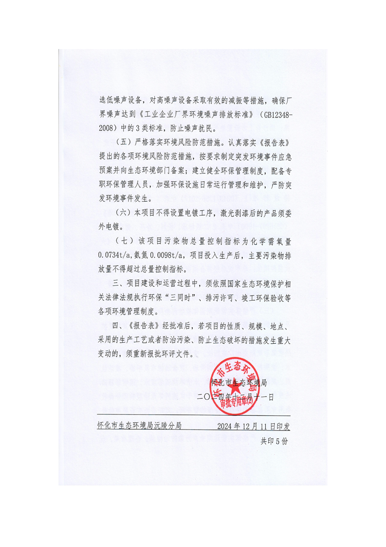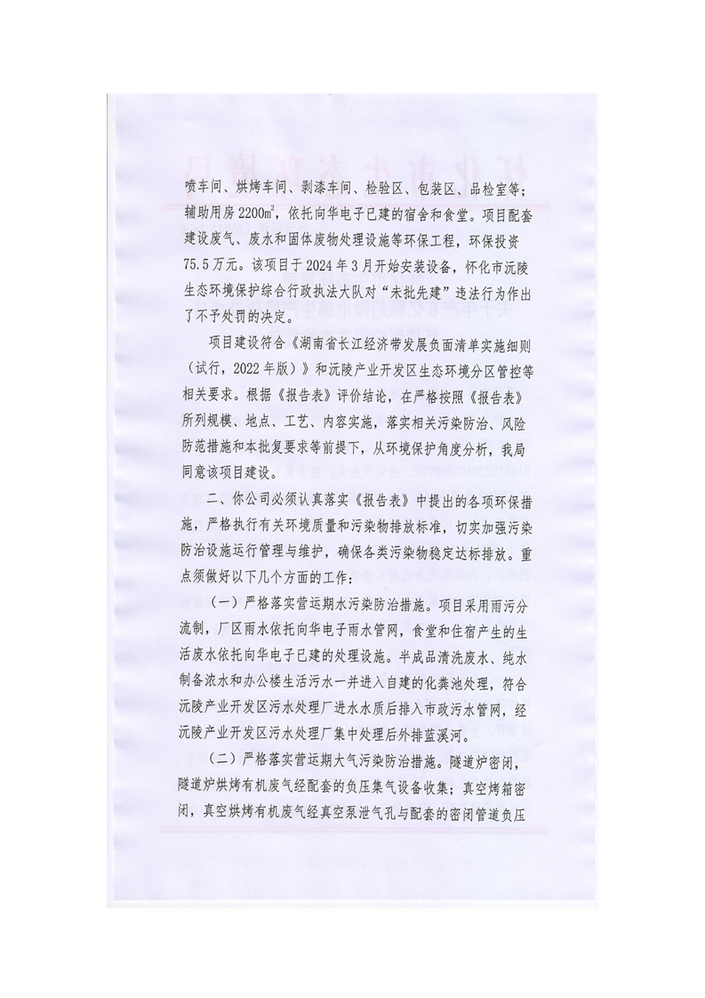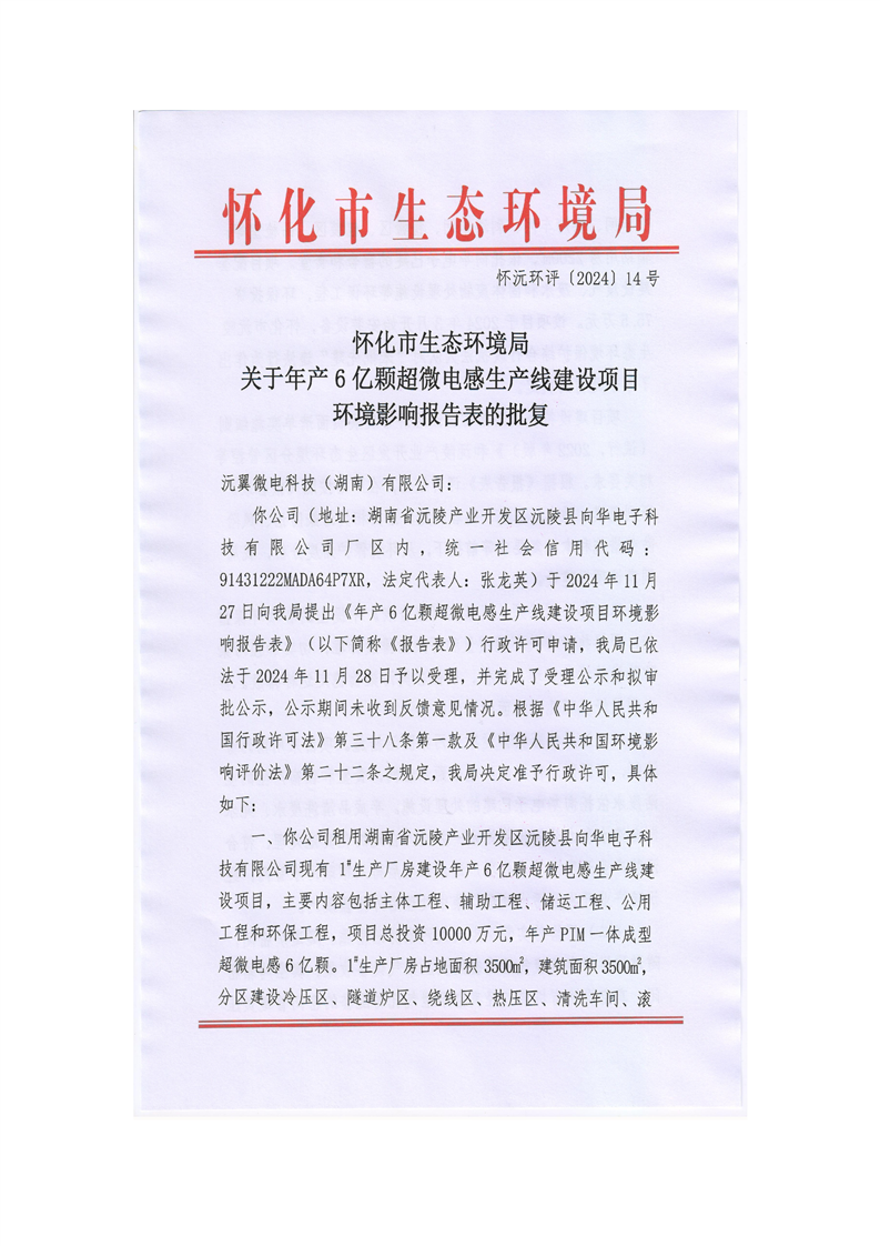 怀化市生态环境局关于年产6亿颗超微电感生产线建设项目环境影响报告表的批复