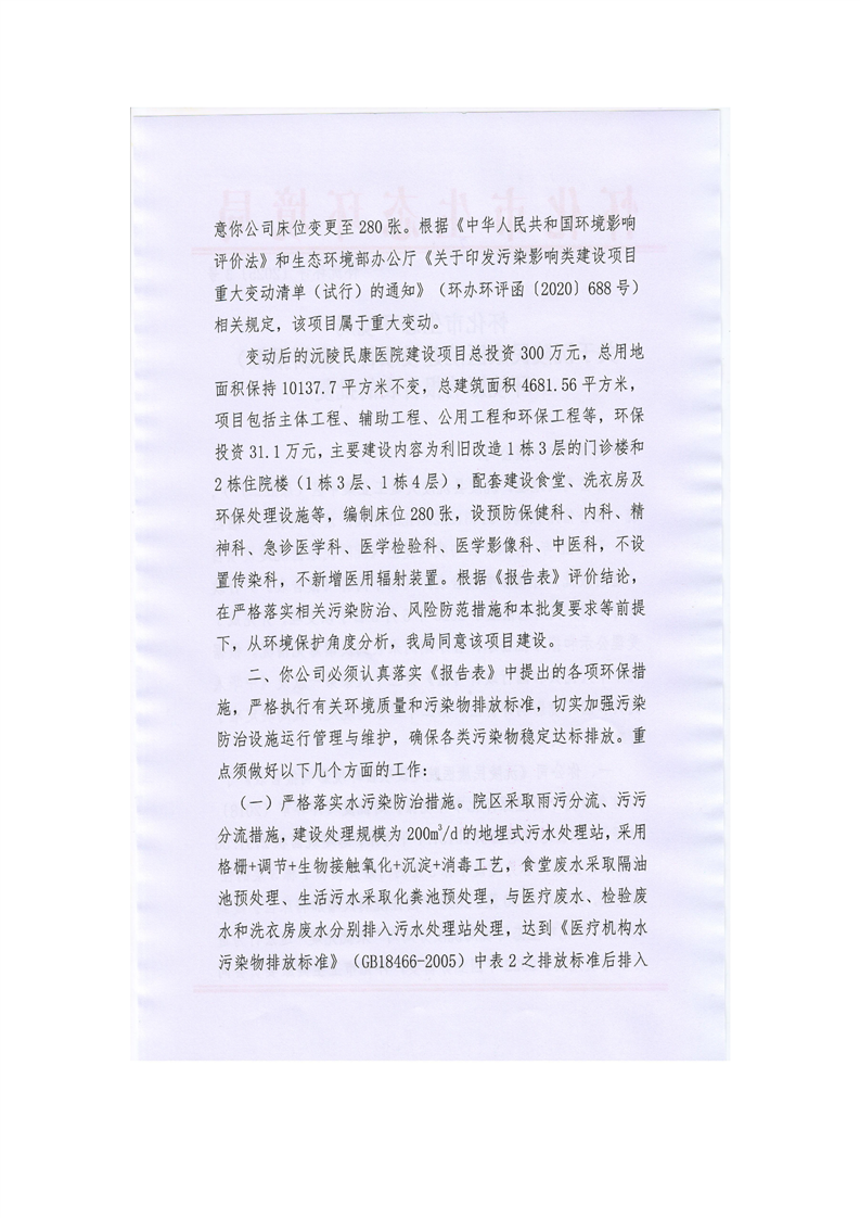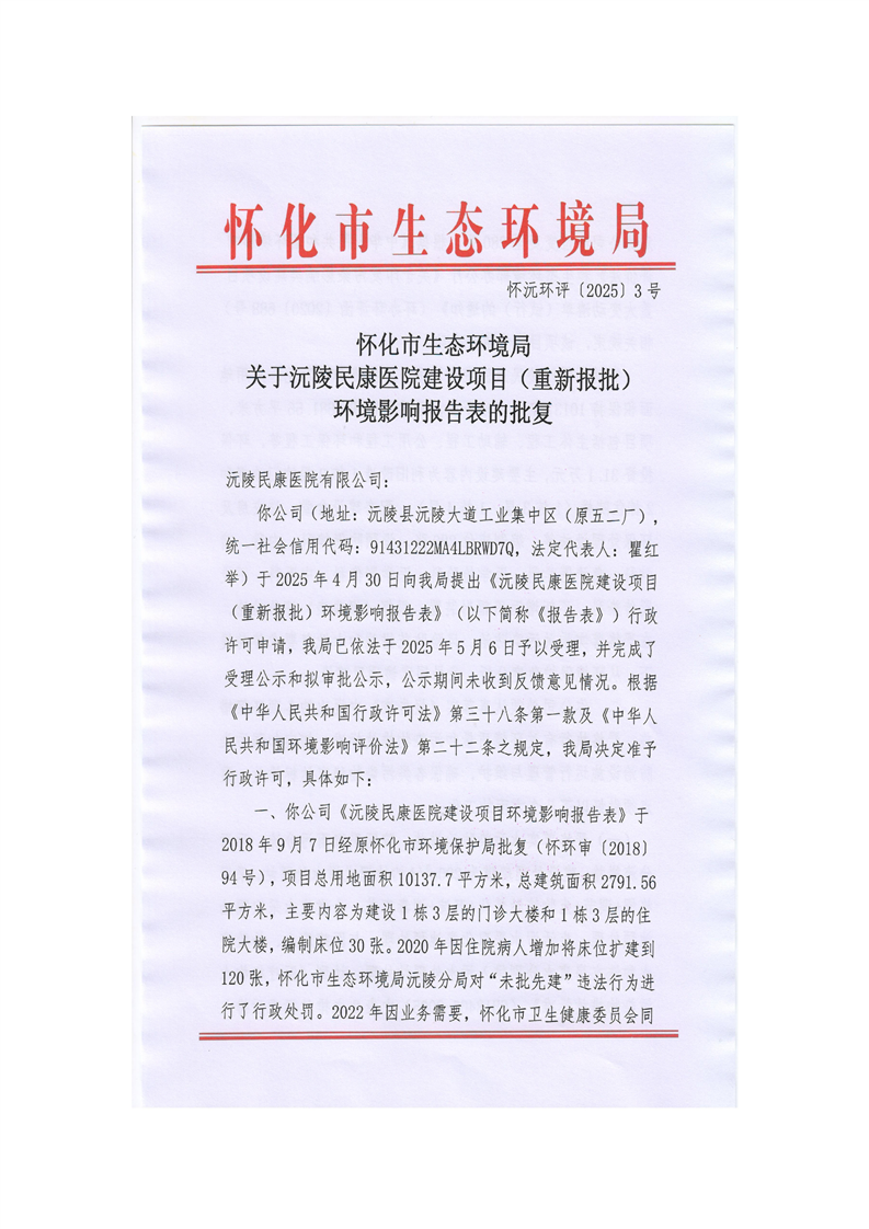 怀化市生态环境局关于沅陵民康医院建设项目(重新报批)环境影响报告表的批复