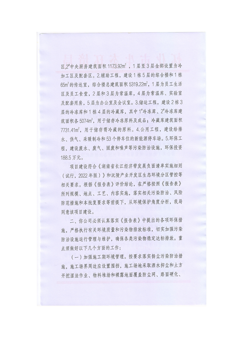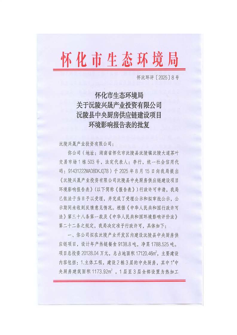 怀化市生态环境局关于沅陵兴晟产业投资有限公司沅陵县中央厨房供应链建设项目环境影响报告表的批复