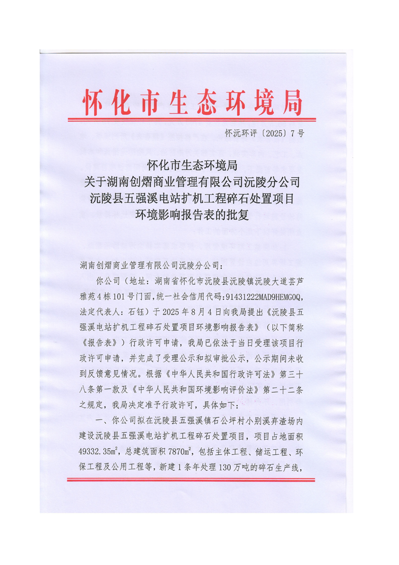 怀化市生态环境局关于湖南创熠商业管理有限公司沅陵分公司沅陵县五强溪电站扩机工程碎石处置项目环境影响报告表的批复