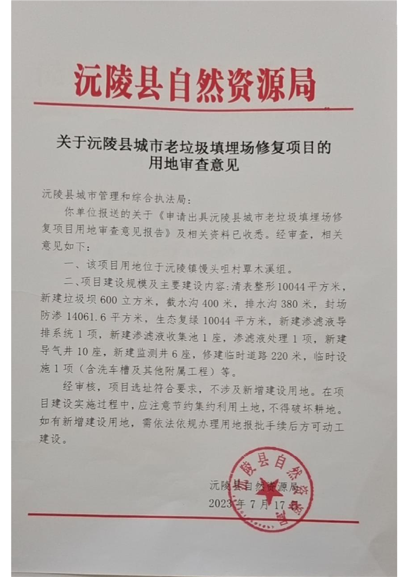 关于沅陵县城市老垃圾填埋场修复项目的用地审查意见