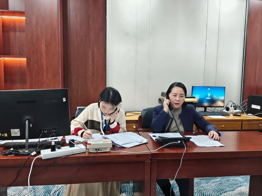 在省第五生态环境保护督察信访接电室,魏旋君(右)接听了一起群众生态环境问题举报电话。