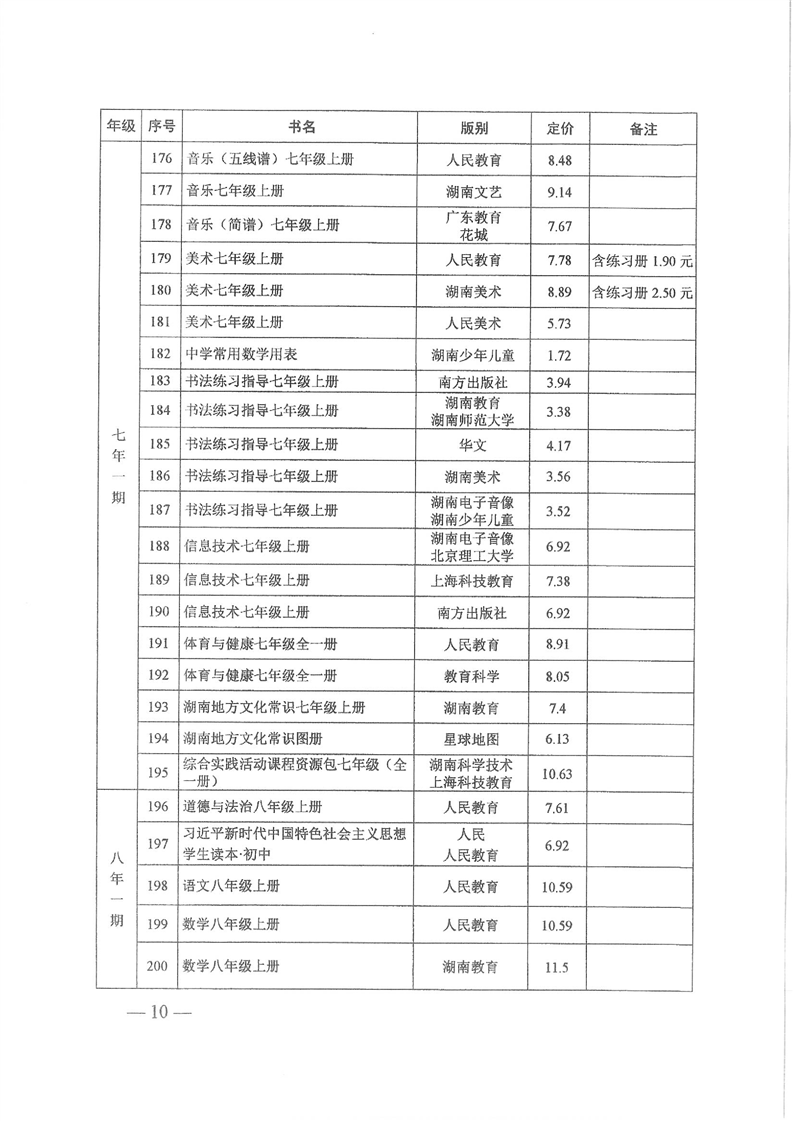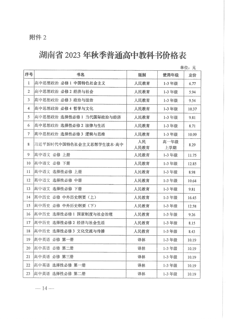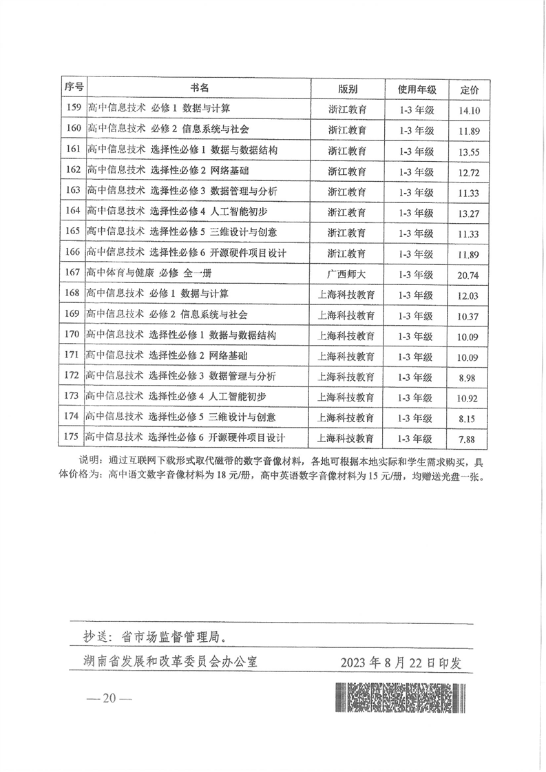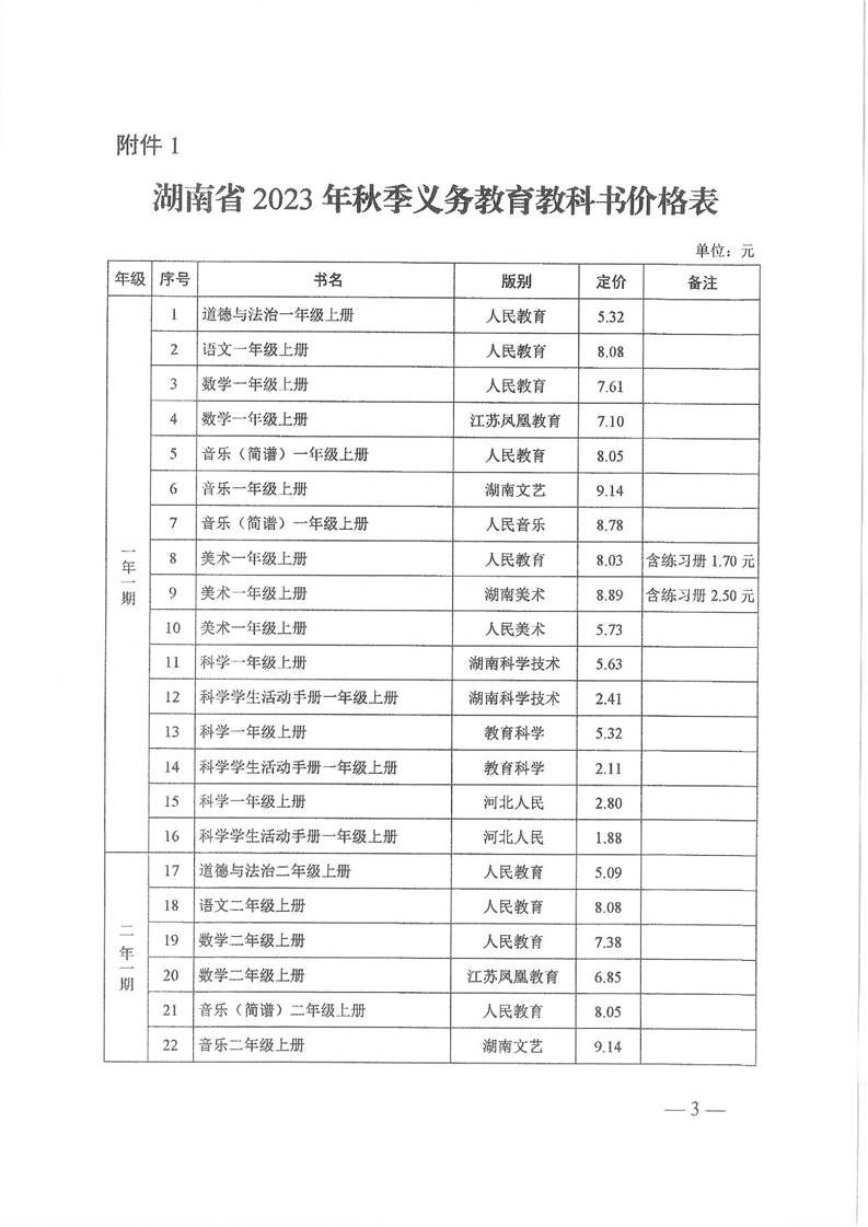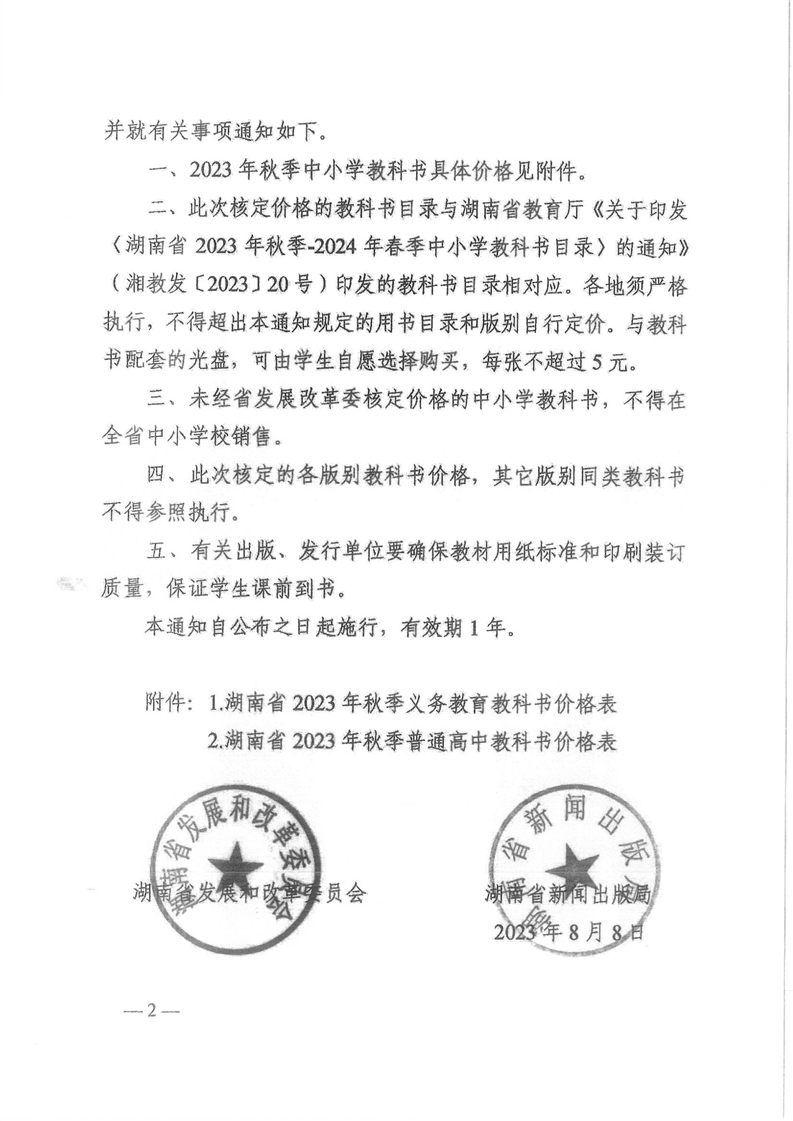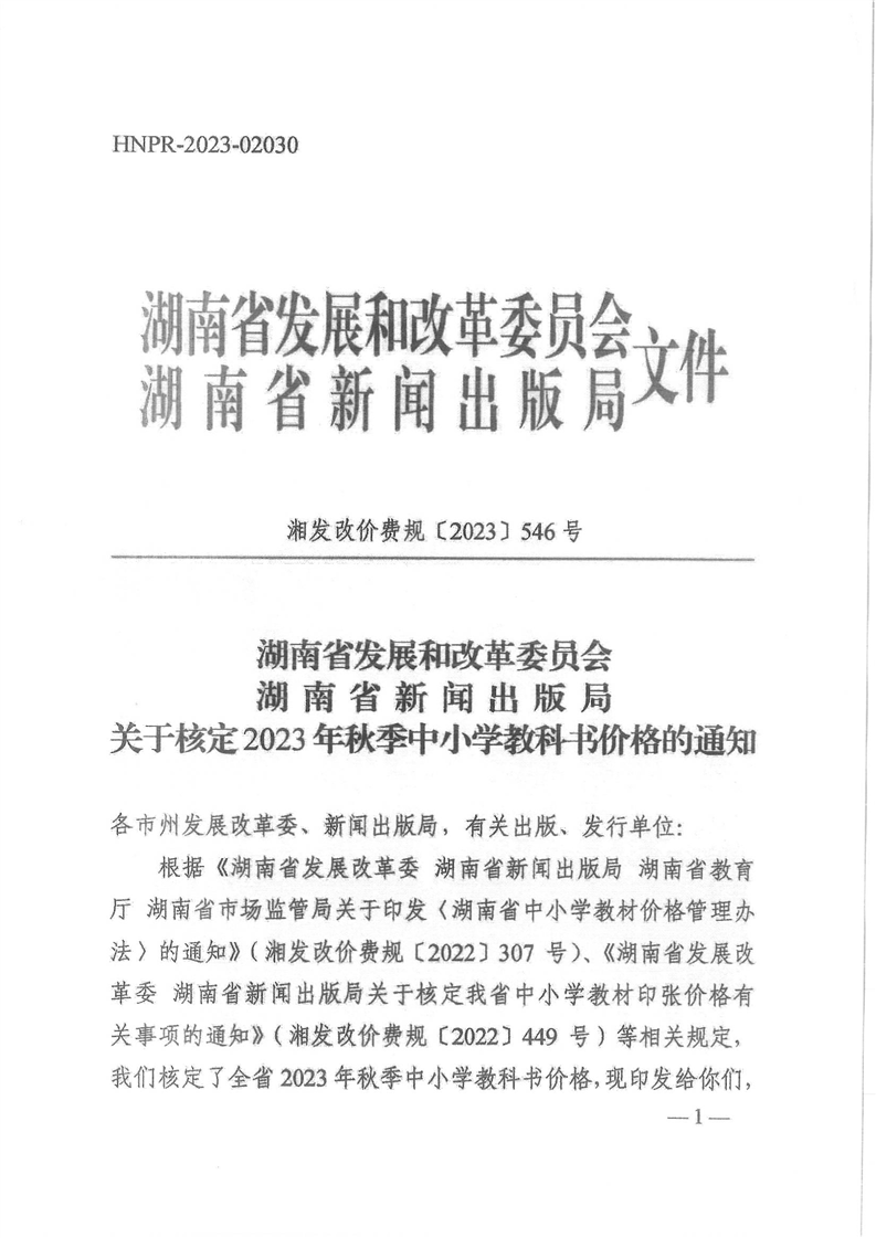湖南省发展和改革委员会 湖南省新闻出版局 关于核定2023年秋季中小学教科书价格的通知