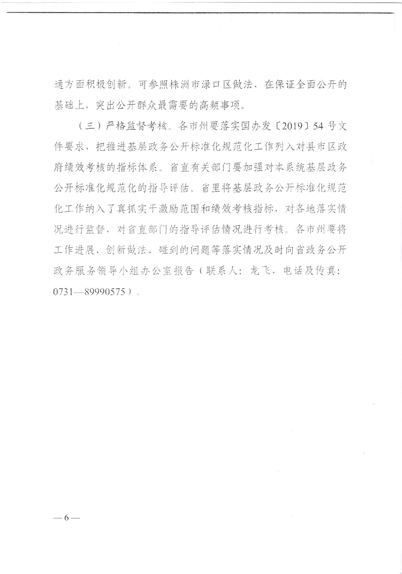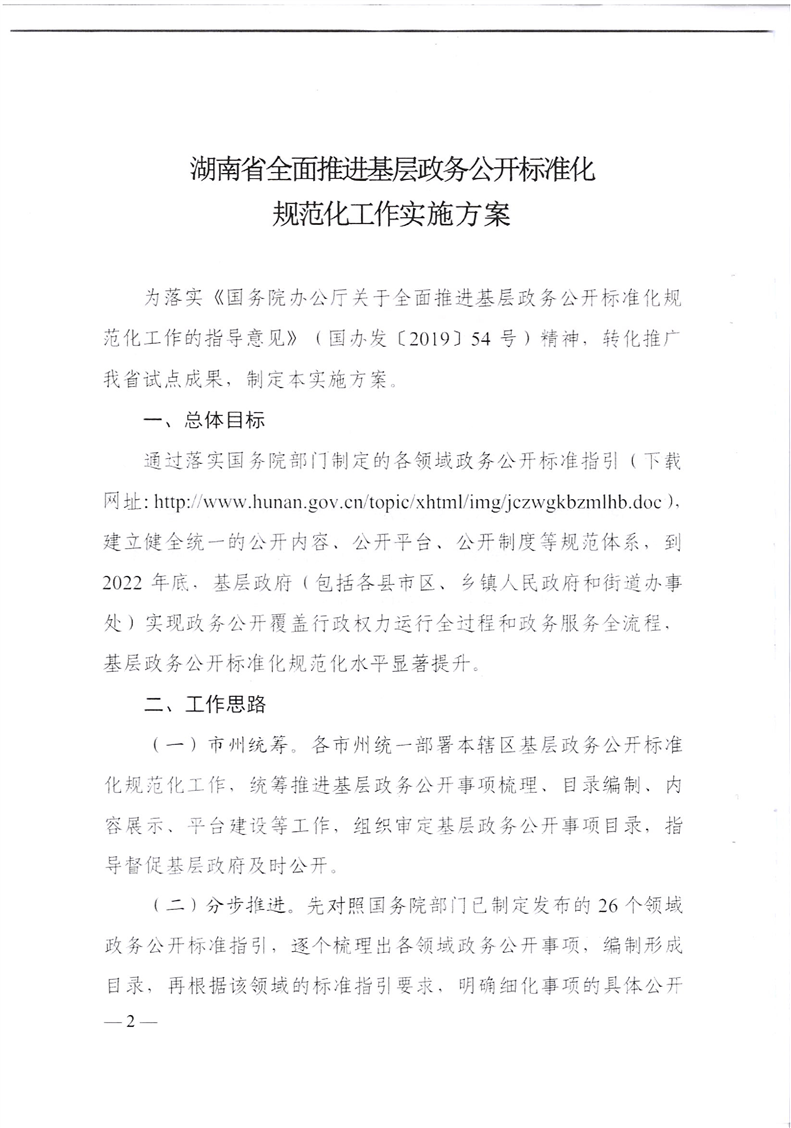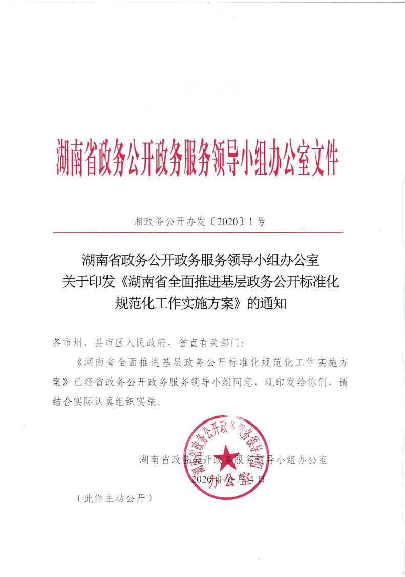 湖南省政务公开政务服务领导小组办公室关于印发《湖南省全面推进基层政务公开标准化规范化工作实施方案》的通知(湘政务公开办发〔2020〕1号)