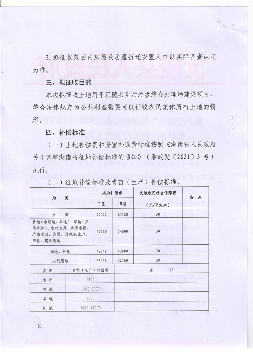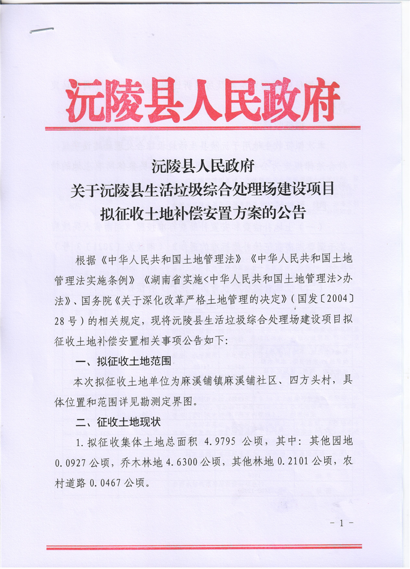 【土地征收】沅陵县人民政府关于沅陵县生活垃圾综合处理建设项目拟征收土地补偿安置方案的公告
