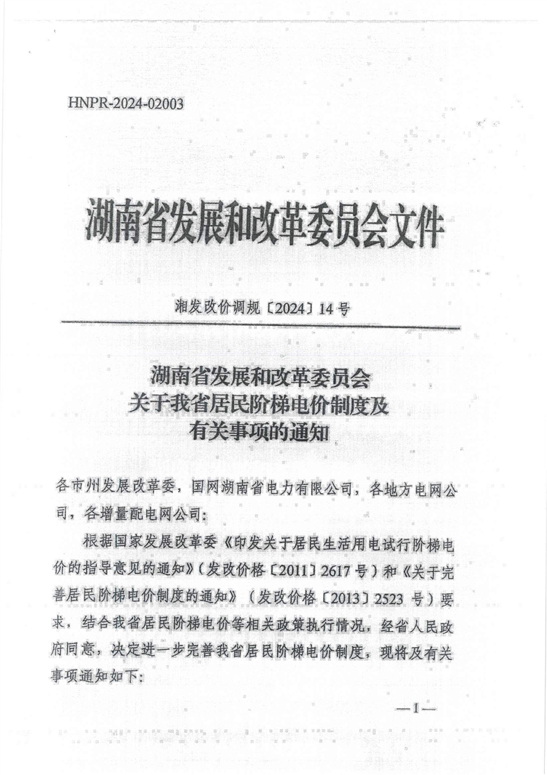湖南省发展和改革委员会关于我省居民阶梯电价制度及有关事项的通知