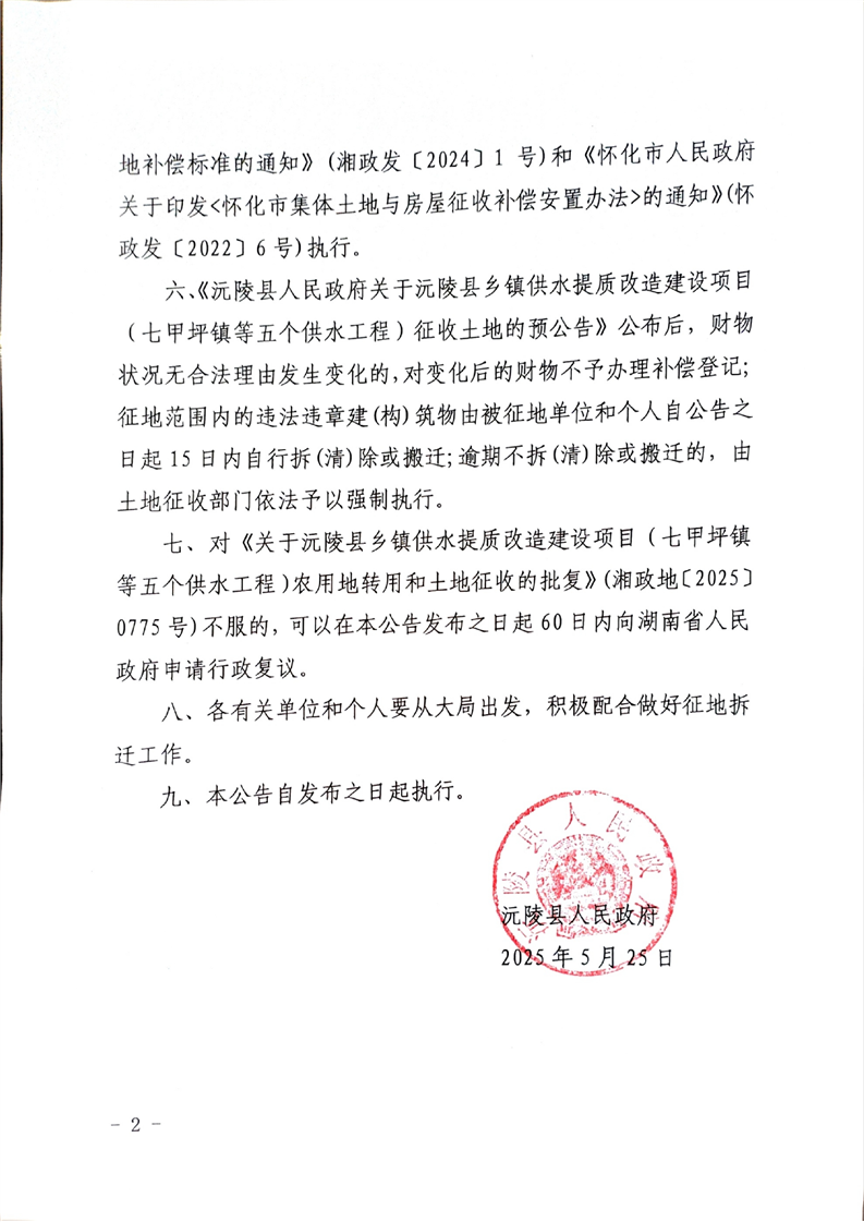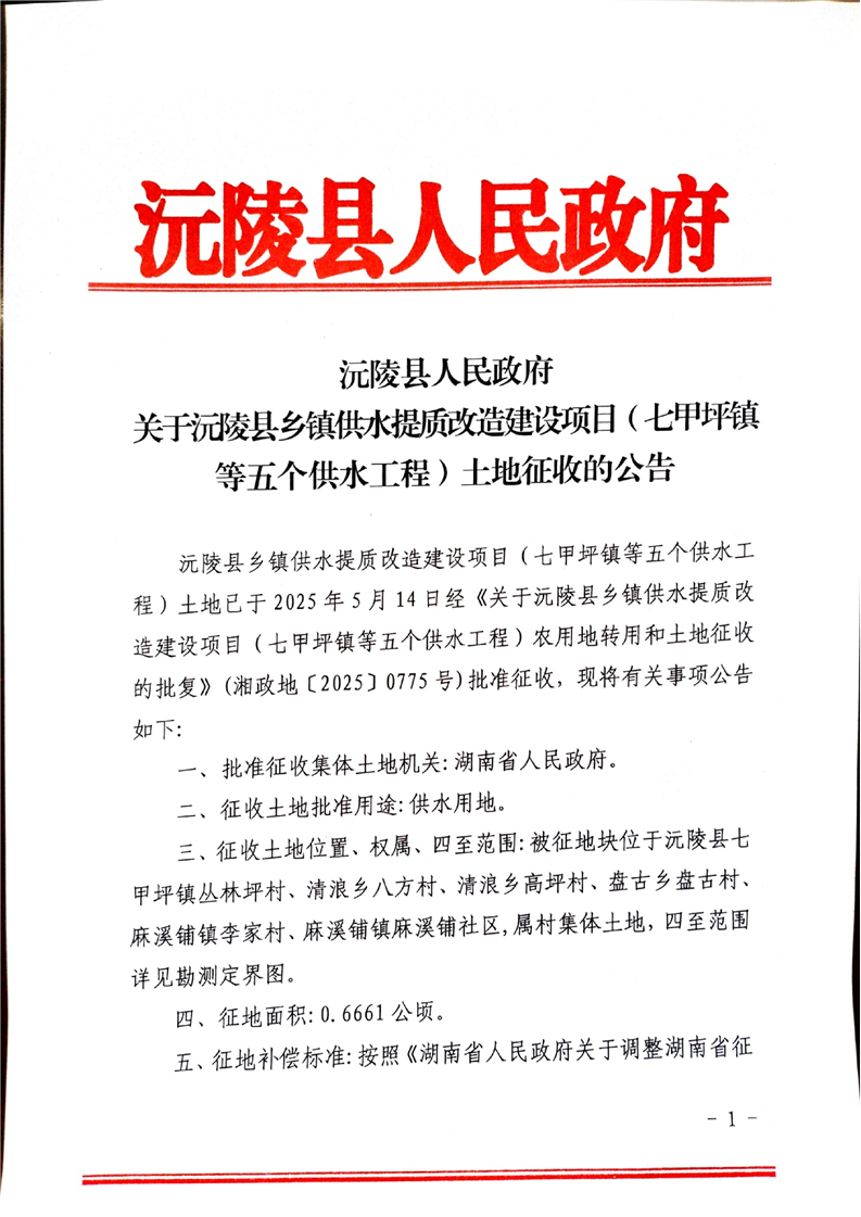 沅陵县人民政府关于沅陵县乡镇供水提质改造建设项目(七甲坪镇等五个供水工程)土地征收的公告