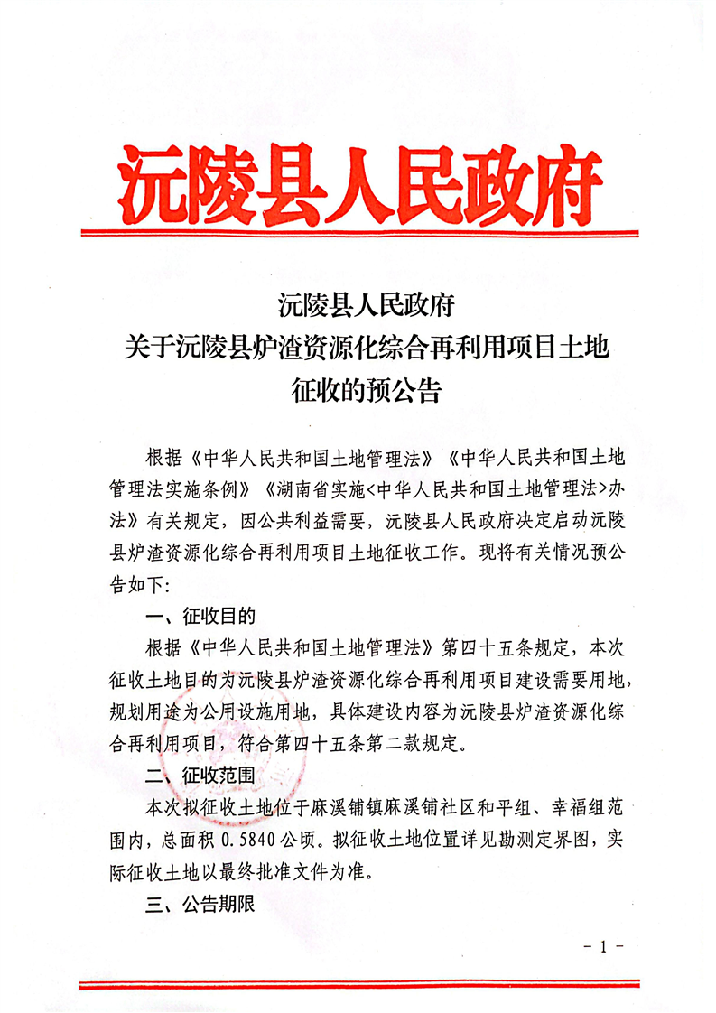 沅陵县人民政府关于沅陵县炉渣资源化综合再利用项目土地征收的预公告