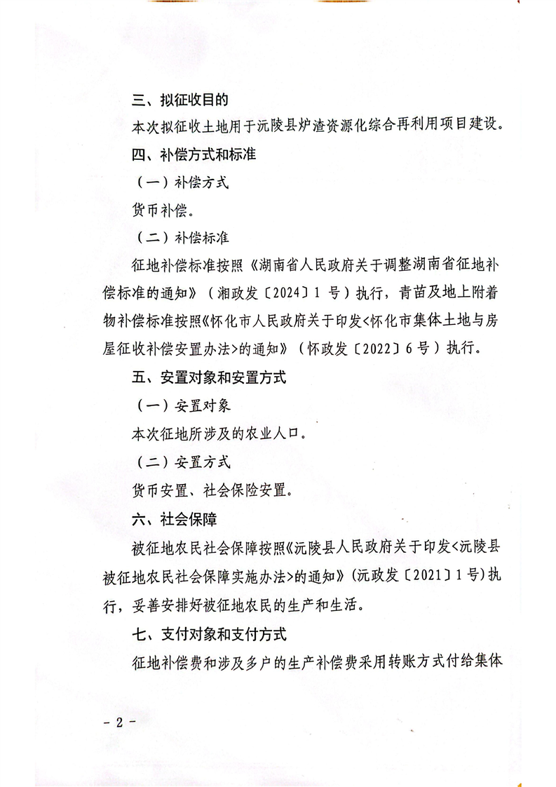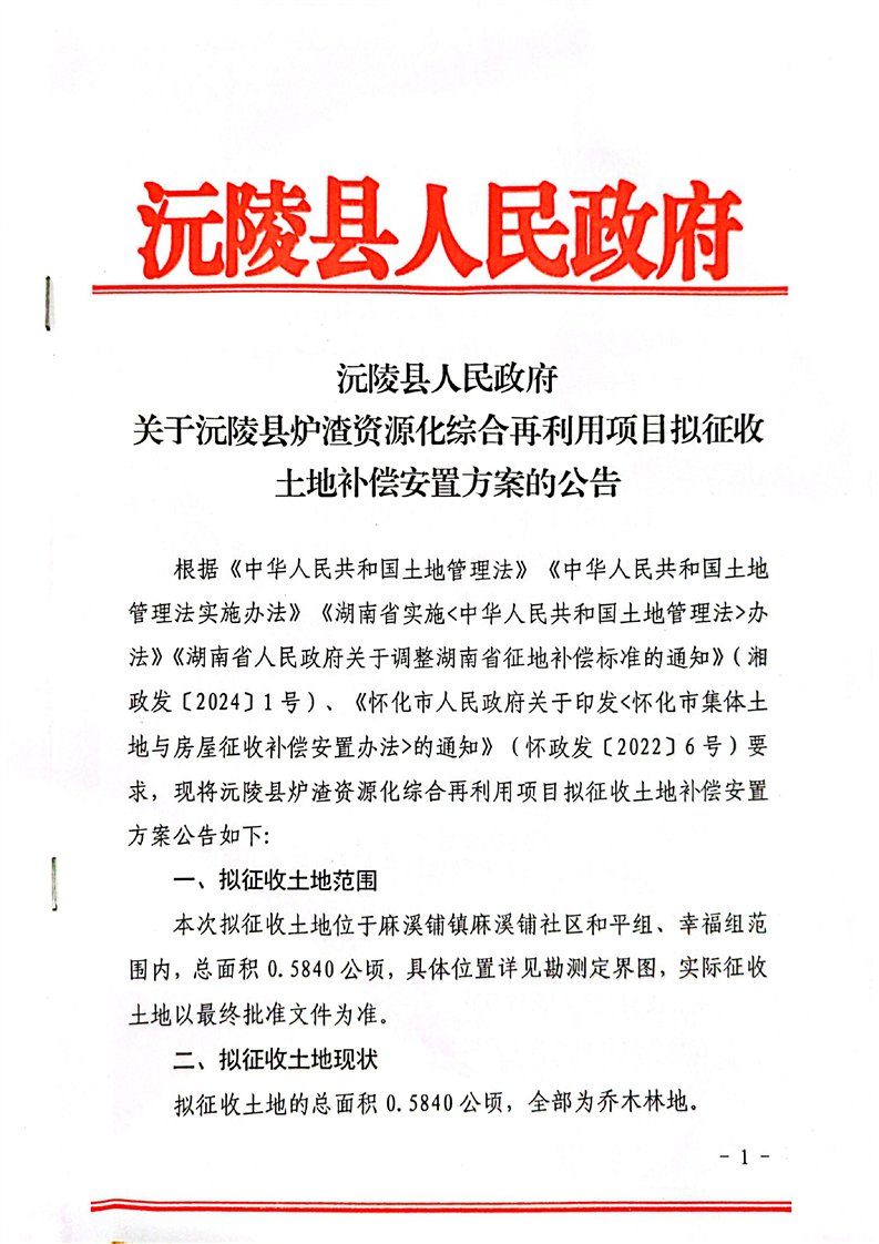 沅陵县人民政府关于沅陵县炉渣资源化综合再利用项目拟征收土地补偿安置方案公告