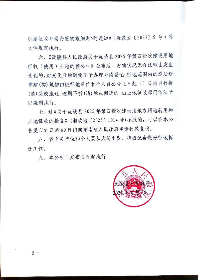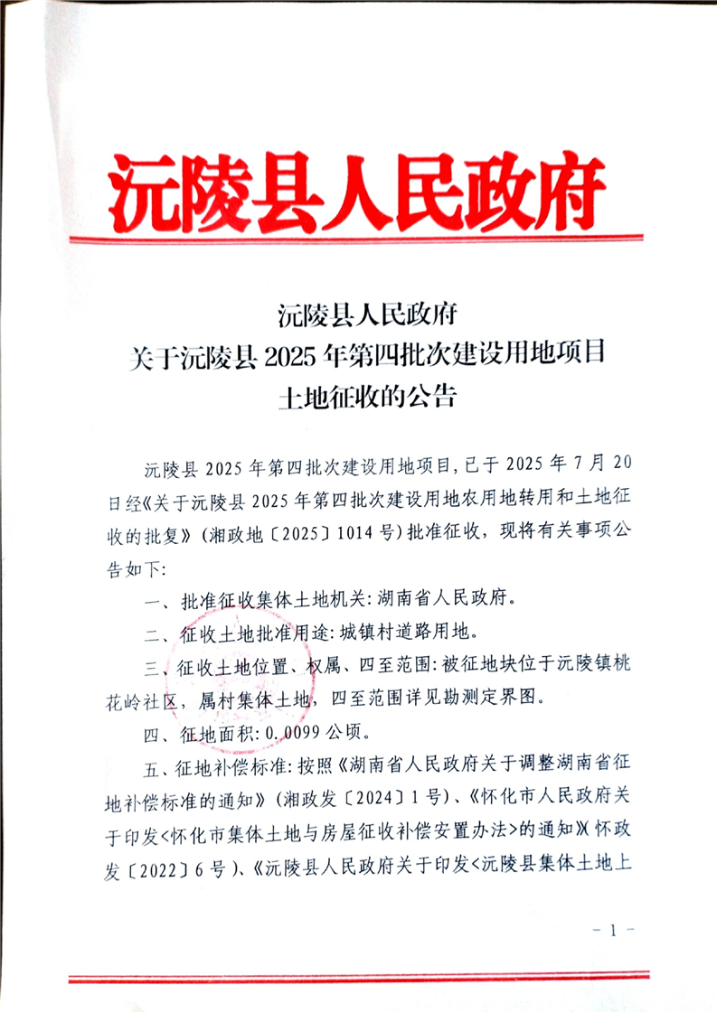 沅陵县人民政府关于沅陵县2025年第四批次建设用地项目土地征收的公告