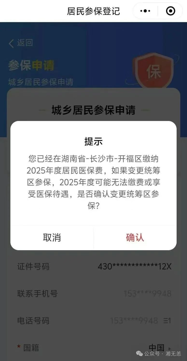 如果您正常参加湖南省居民医保且已缴纳当年度居民医保费,这时系统会弹出提示“您已经在XX统筹区缴纳XX年度居民医保费,如果变更统筹区参保可能无法缴费或享受医保待遇,是否确认变更统筹区参保?”(温馨提示:已经缴纳当年居民医保费的参保人,只能在缴费地参保才能享受待遇。若想变更参保地缴纳次年居民医保费,建议等到12月份再办理。)