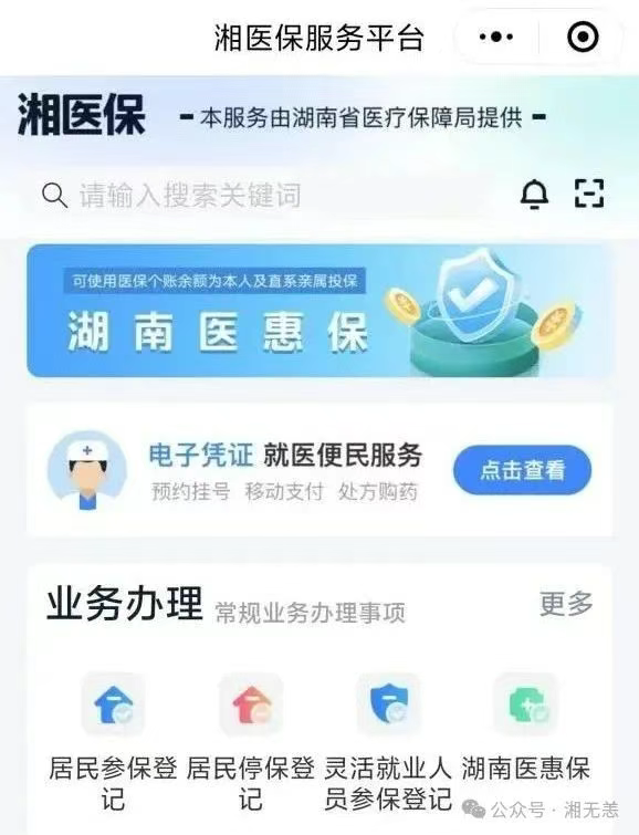 1、点击登录湘医保微信小程序,在首页点击“居民参保登记”,或点击“业务办理(更多)”找到该功能。