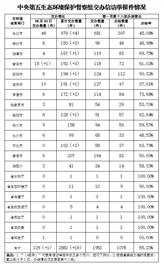 中央第五生态环境保护督察组今天向湖南交办群众信访举报件129件(来电举报87件,来信举报42件),其中重点件6件。我省分解后交办130件,其中重点件7件。