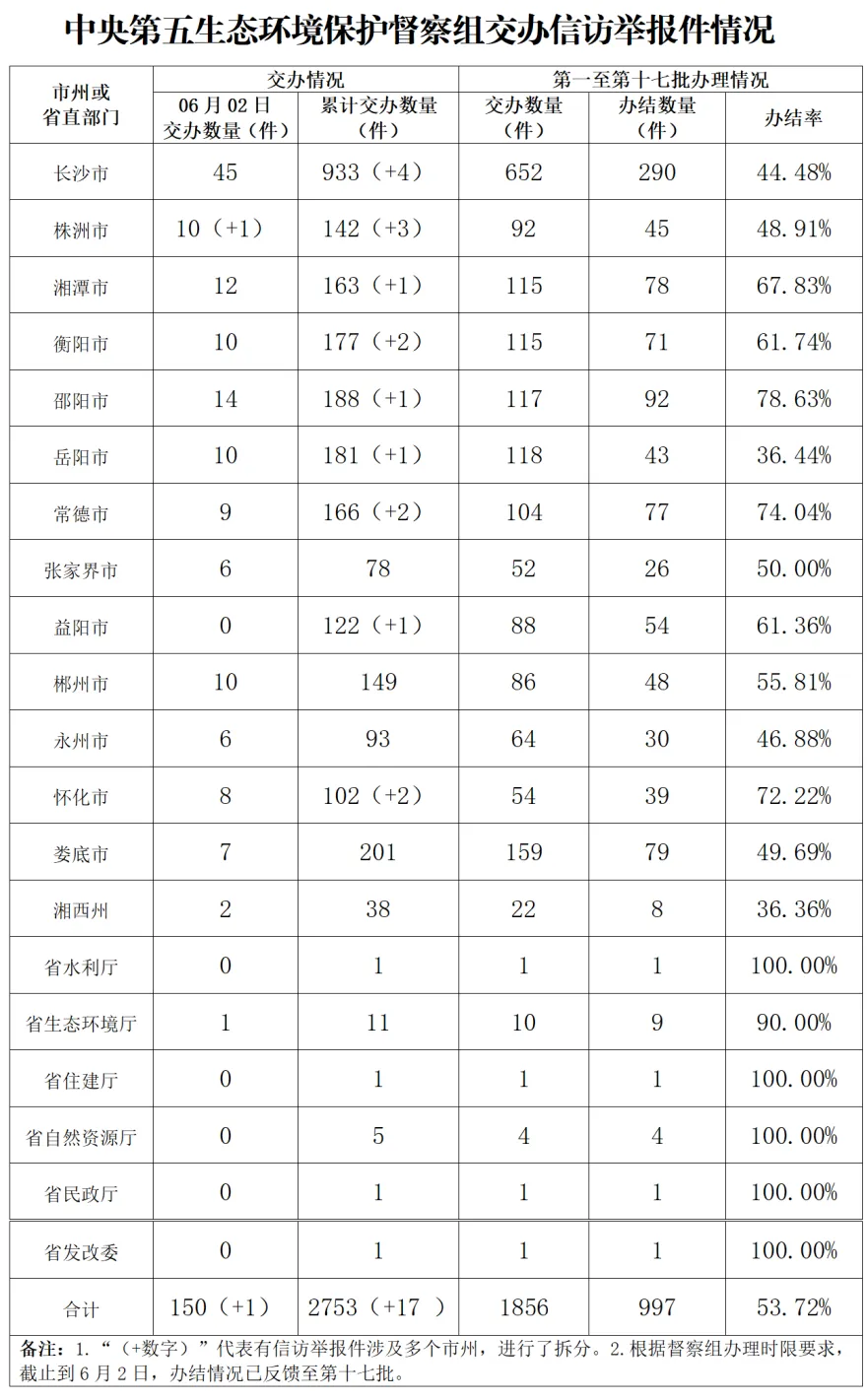 中央第五生态环境保护督察组今天向湖南交办群众信访举报件150件(来电举报84件,来信举报66件),其中重点件10件。我省分解后交办151件,其中重点件10件。