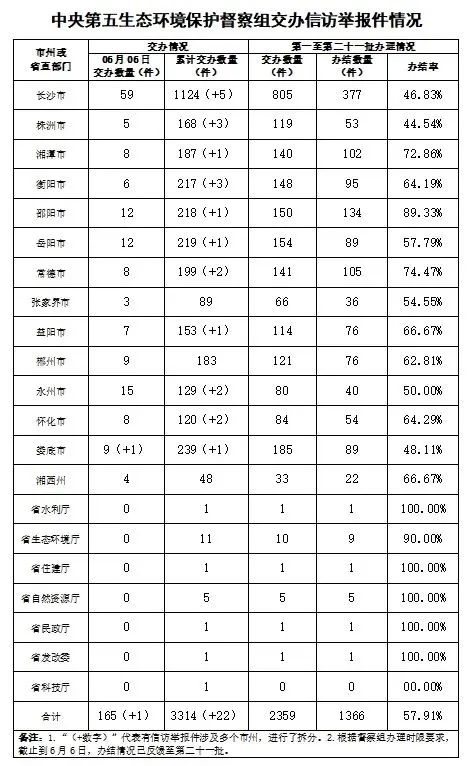 中央第五生态环境保护督察组今天向湖南交办群众信访举报件165件(来电举报85件,来信举报80件),其中重点件7件。我省分解后交办166件,其中重点件7件。